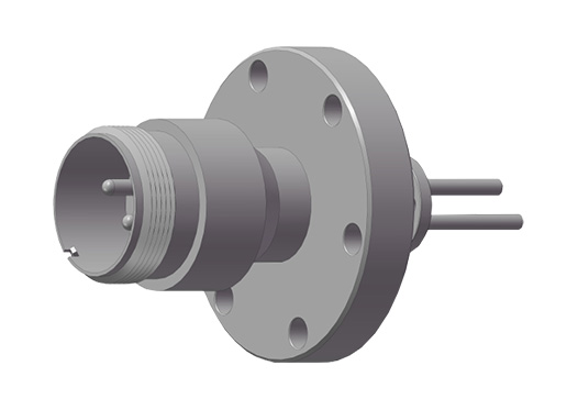 MS型功率真空饋通電極直徑為3.6mm,可選2針或4針,最高電壓為700VDC,鉬電極最大電流為40A/針,鎳電極最大電流為25A/針,溫度范圍-200~450℃,極限真空<1E-10mbar。